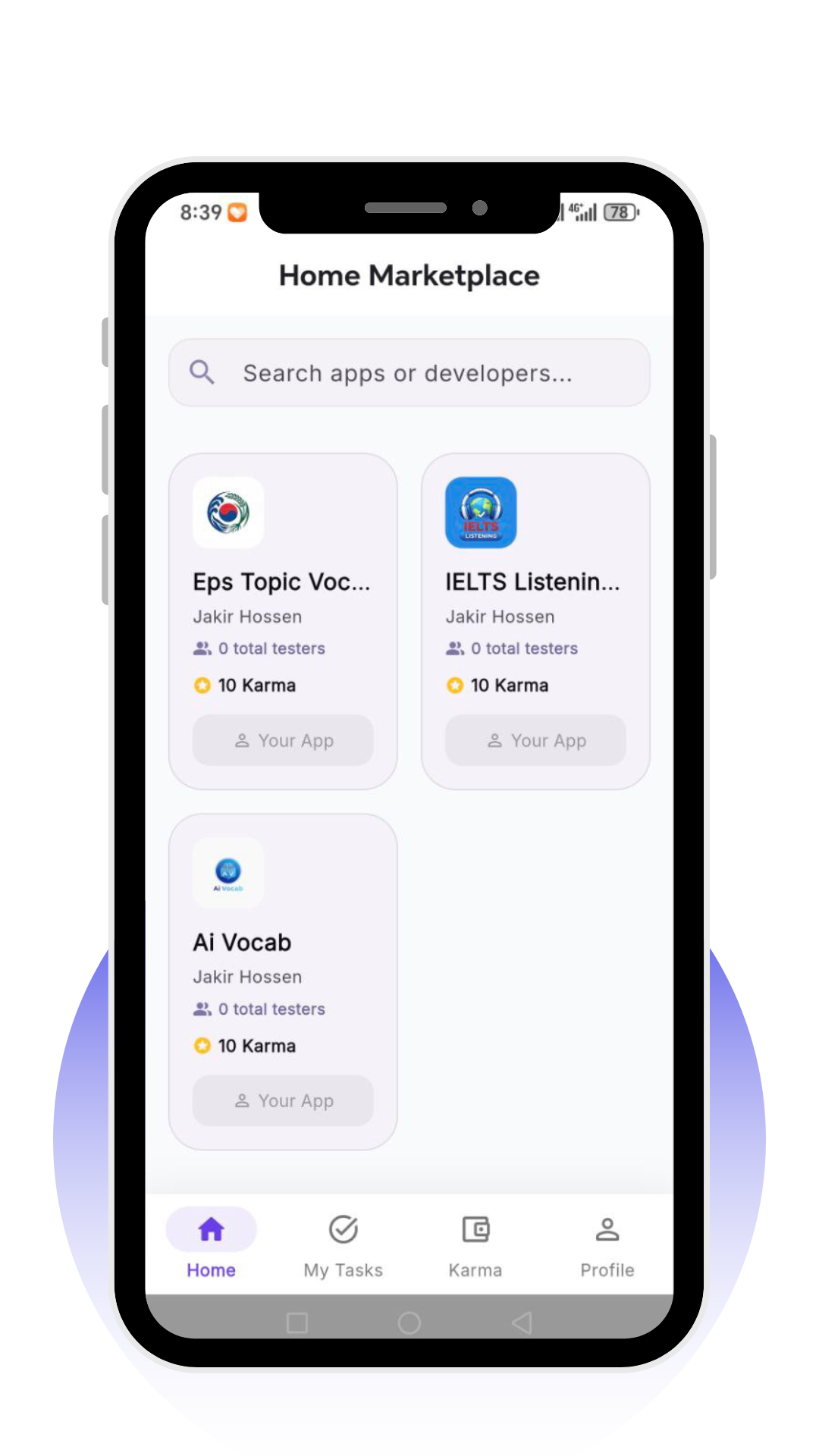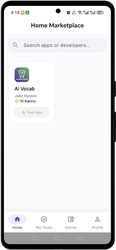 Key features include: secure Google Sign-In authentication, dynamic marketplace of apps for testing, advanced wallet system for tracking Karma rewards, professional dashboard to manage profile and tests, and a user-friendly interface optimized for seamless experience.